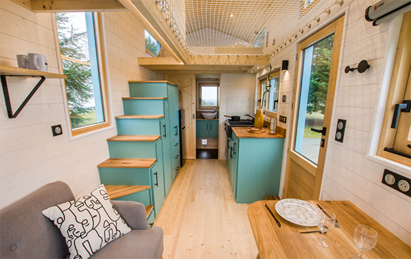 I was in a search to find tiny homes from all over the world. That’s when I landed in France. The Kalzennig immediately caught my eye for its stunning blue color. A vibrant pop against the wood. Additionally, they carried the same two-toned look through the rest of the home. Another feature that caught my eye: walking in you find a net above your head. It may seem like an odd addition at first. However, this home was creative in it’s use of space.