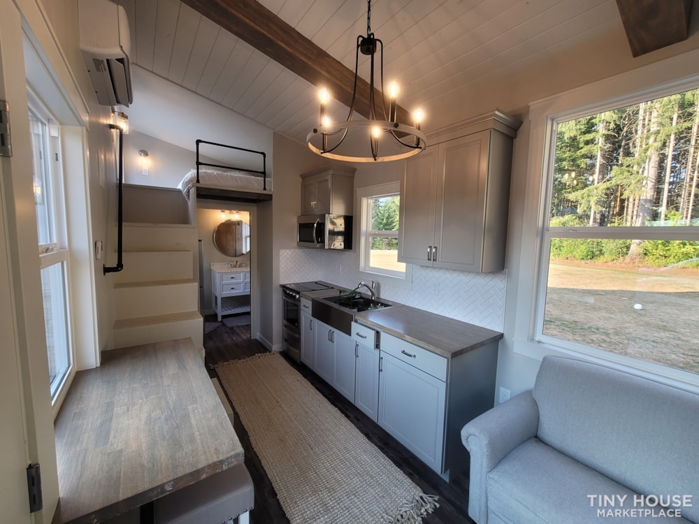 Every home has it’s own personality. Though really the personality comes from the builders. A man that built custom homes for ten years works with his two sons on making a tiny home. Lots of care and attention to detail; shown through added features. A removable front porch cover comes with four lag screws for easy hauling. The kitchen includes a full slide in range oven and gas cook top with drawers below. Washer and dryer hookups are sneakily hidden in the bathroom behind the barn door. Not to mention, the floors are Rock Wool Insulation R30 value. Click the link below to our marketplace to see even more specifications for this home.