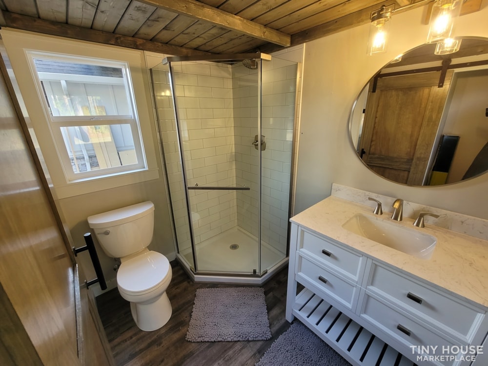 Speaking of comfort, the bathroom excels at this. Every one needs the bathroom throughout each day. So, it should be comforting right? The barn door gives extra space in the bathroom while maintaining privacy. Additionally, a bathroom sink with counter space can be a rarity in a tiny home. Ultimately, the favorite of the bathroom has to be the shower. Being in the corner allows a full sized shower without needing too much space. I keep mentioning space because the bathroom is almost always the smallest room of a tiny home. Make sure to get the most out of your space.