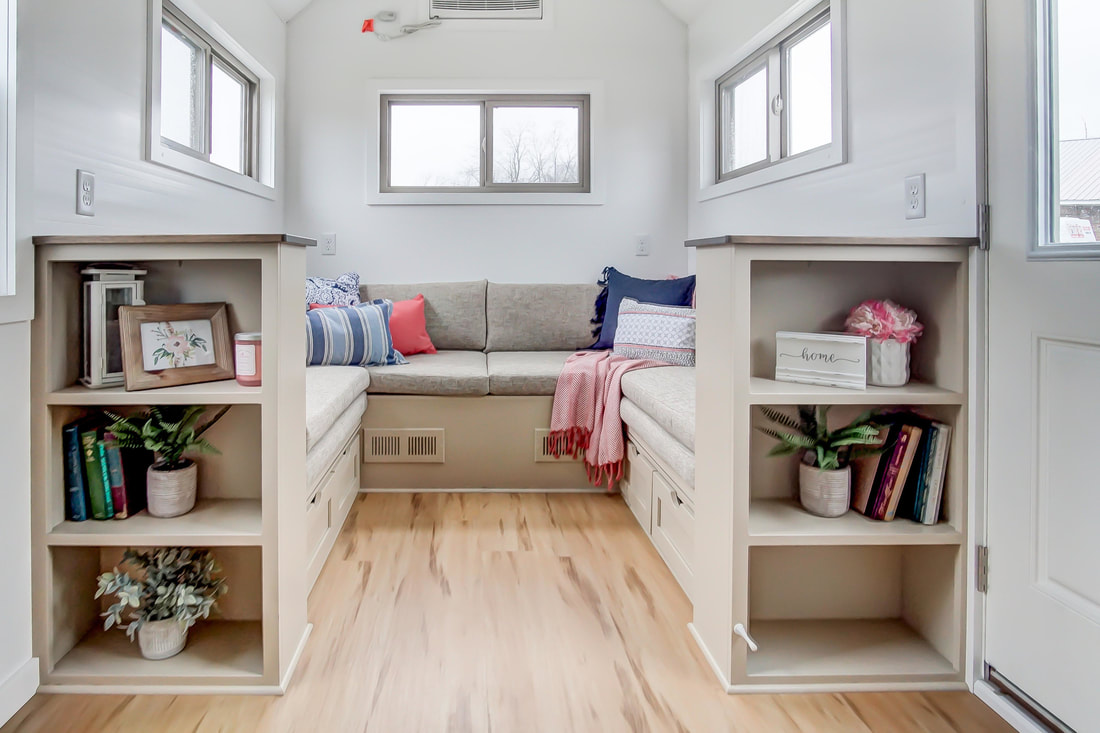 What is a pearl to the oyster? Sand combined with pressure makes a beautiful byproduct. Comparatively, like the tiny homes we see, the best made by hard work and dedication. Furthermore, Modern Tiny Living makes amazing homes suited towards the customers needs. The living area is a great example of this. Double end bookshelves and storage under the couch for maximum space. Additionally, pull the drawers out and convert the couch into a second bed for guests. You can even get a foldout table to make a secondary eating area.
