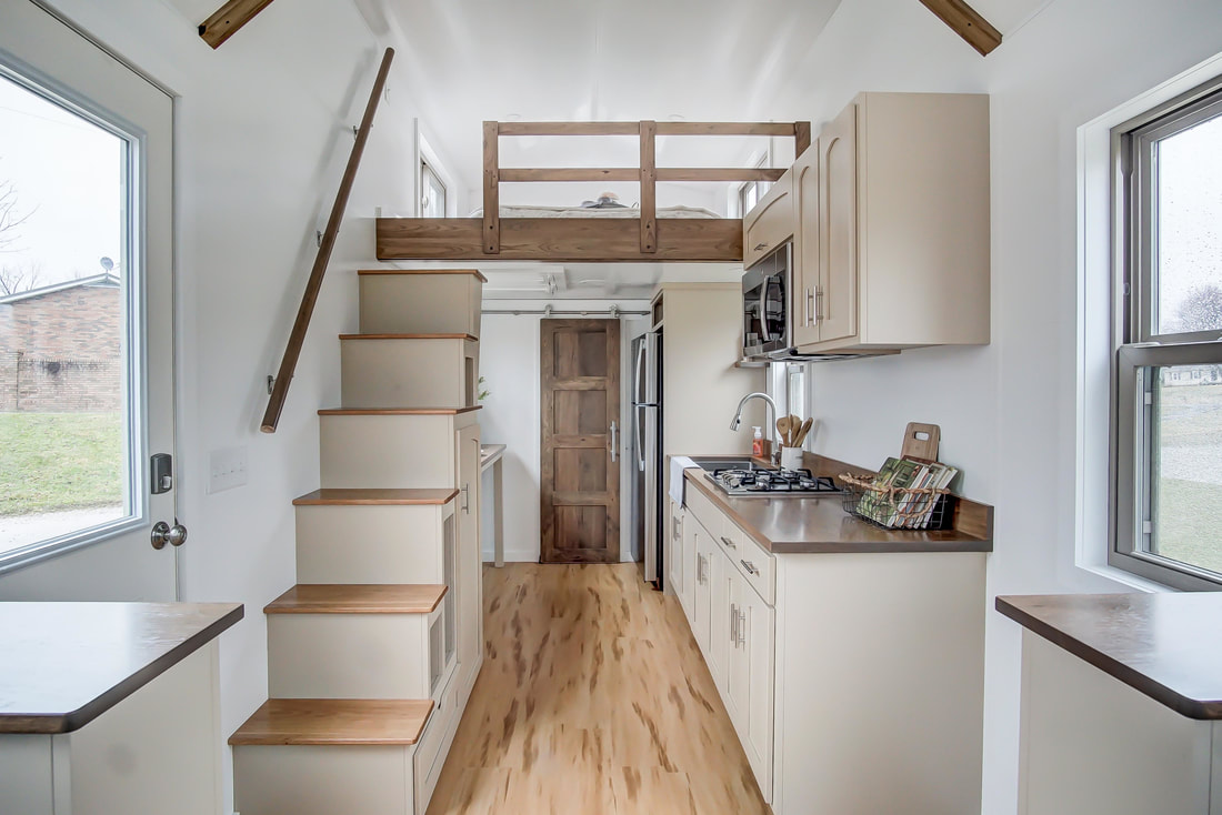 Then turn around to find an amazing kitchen and adorable breakfast nook. Matching hickory countertops throughout match the barn door. Not to mention, the kitchen comes with everything except an oven. Which can be a deal breaker in itself. That is why it is so important to consider what you want your tiny home to have; or what you use in your day to day life. Next up, would have to be the bathroom. Fitted with simply a standard flush toilet and a fiberglass shower. Overall, this home may not have every feature, but every feature is of quality. Continue to consider what you can not live without.